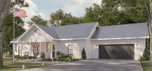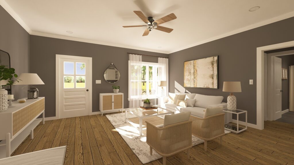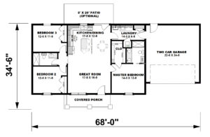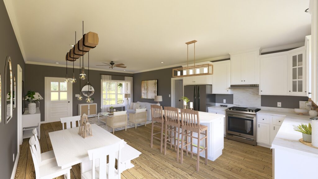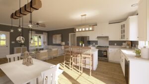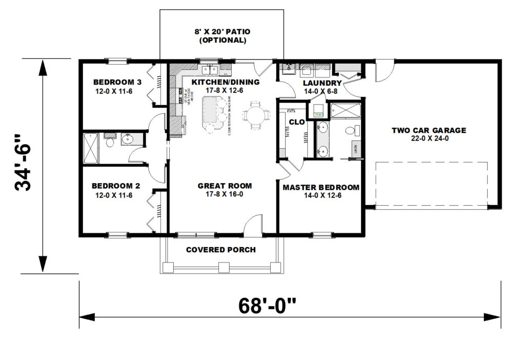 The kitchen has a large island with a counter-high snack bar. French doors lead out onto the optional patio.