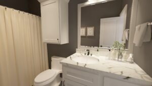 The master bath has dual sinks, a tub/shower combo, and storage.
