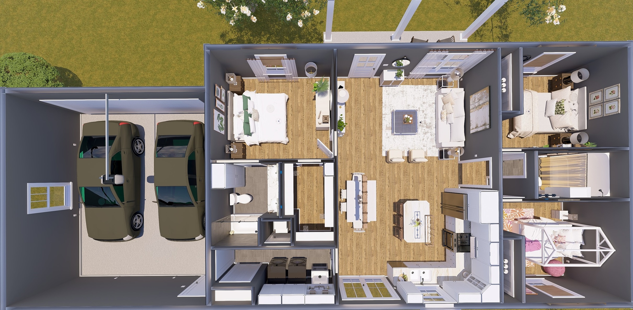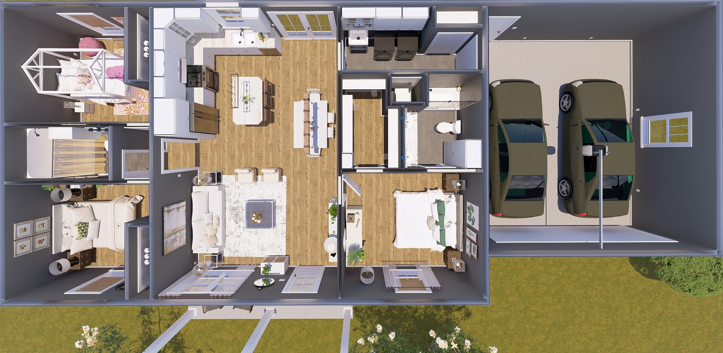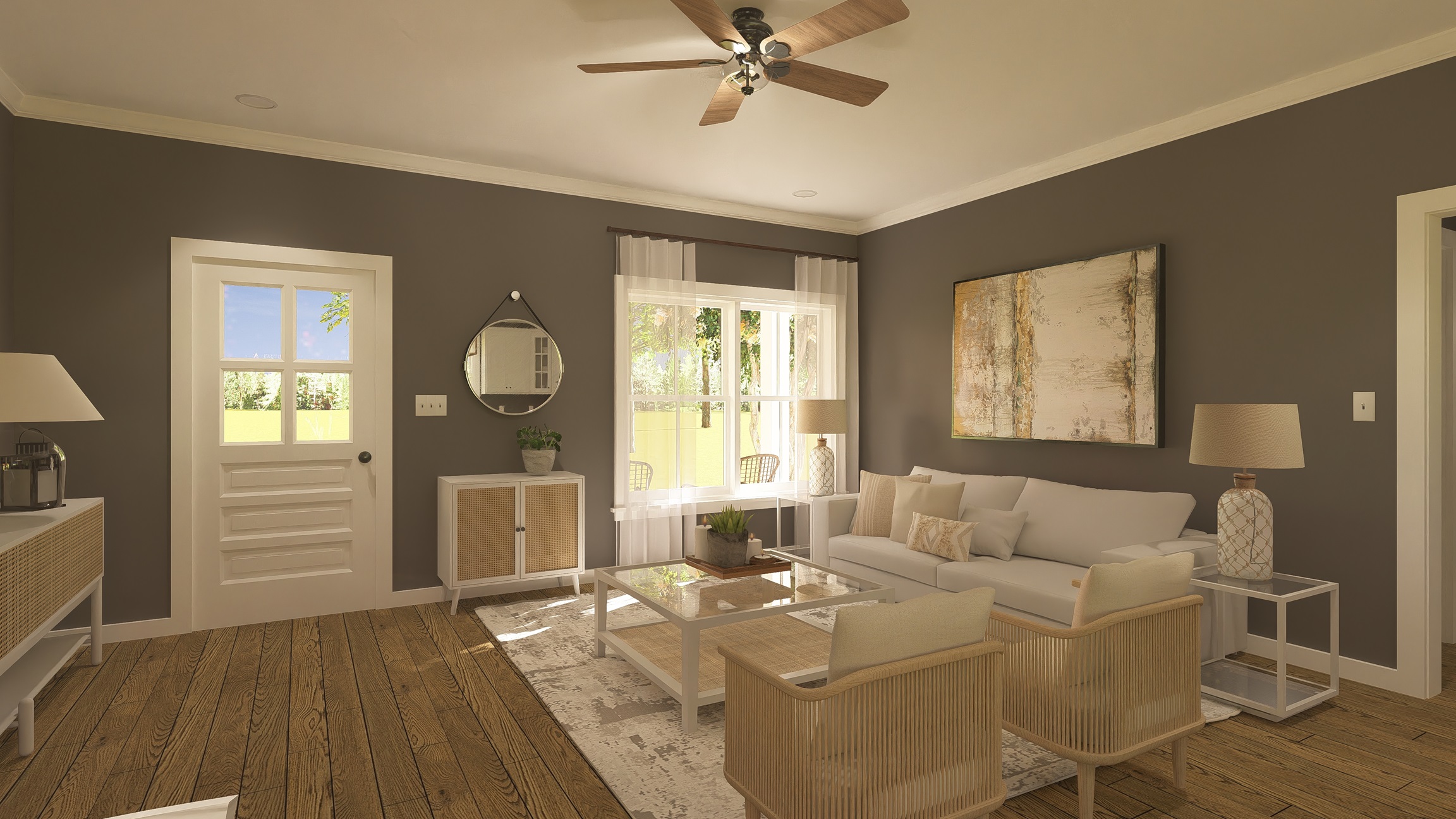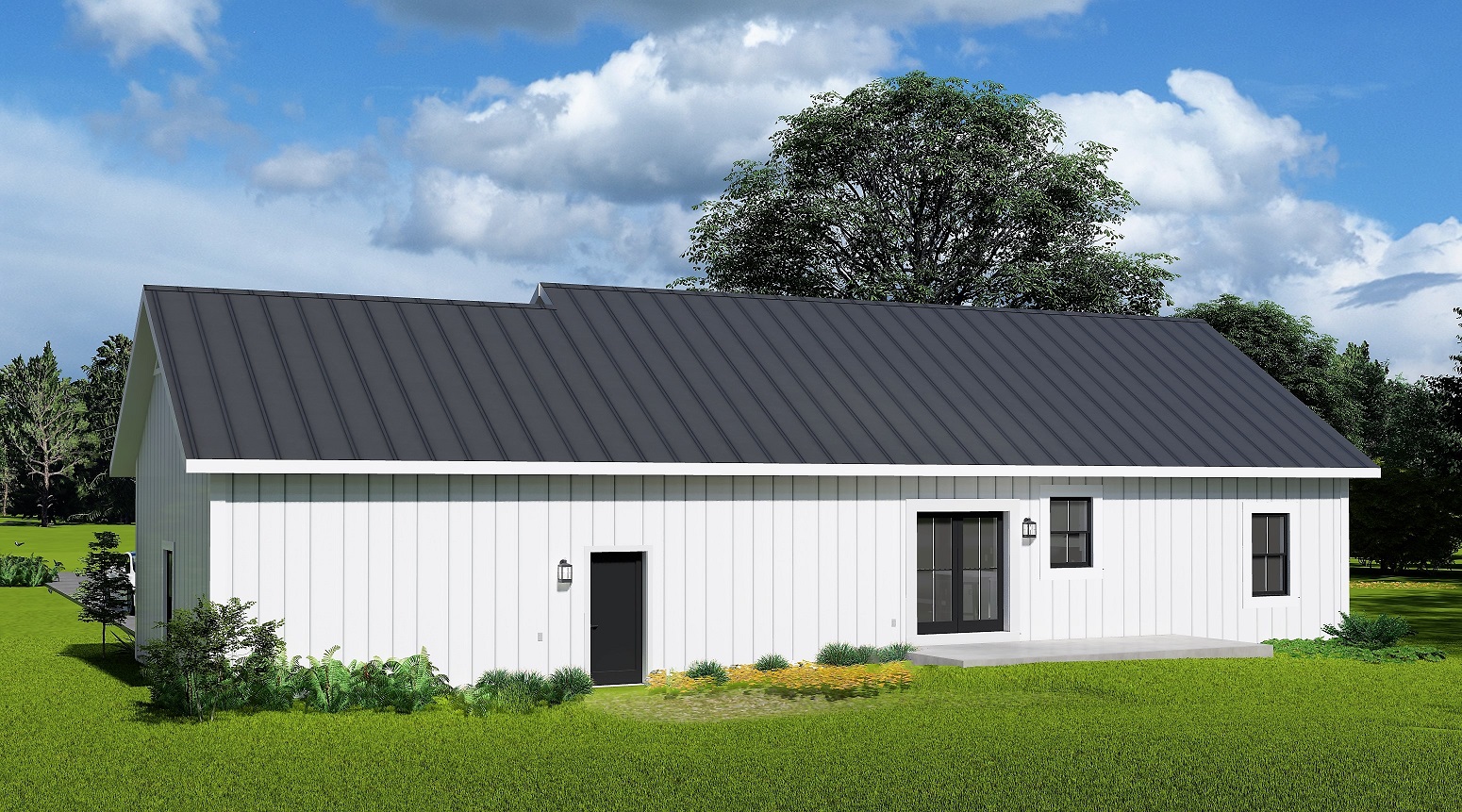 The kitchen has a large island with a counter-high snack bar. French doors lead out onto the optional patio.