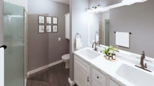 The Master Bath has dual sinks, tub/shower combo, a window for light, and plenty of storage.