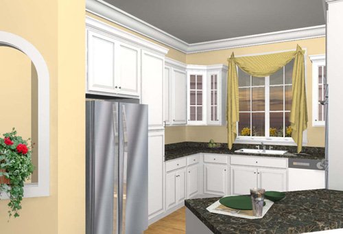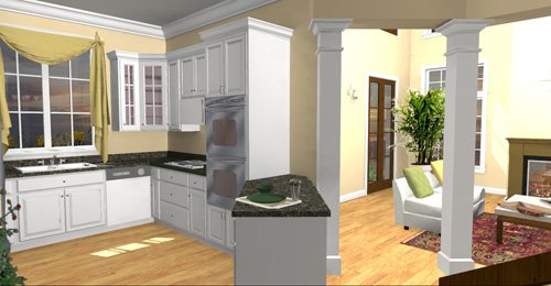The Kitchen is highlighted with a view into the Great Room and lots of cabinet space. Two niches offer unique angles and extra storage around the angled stairs.