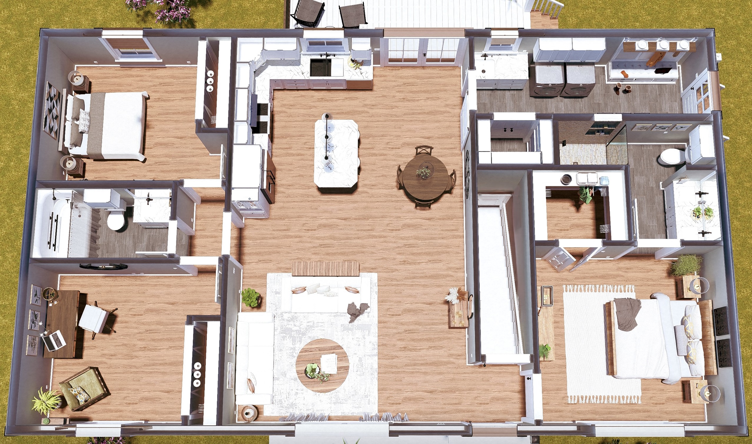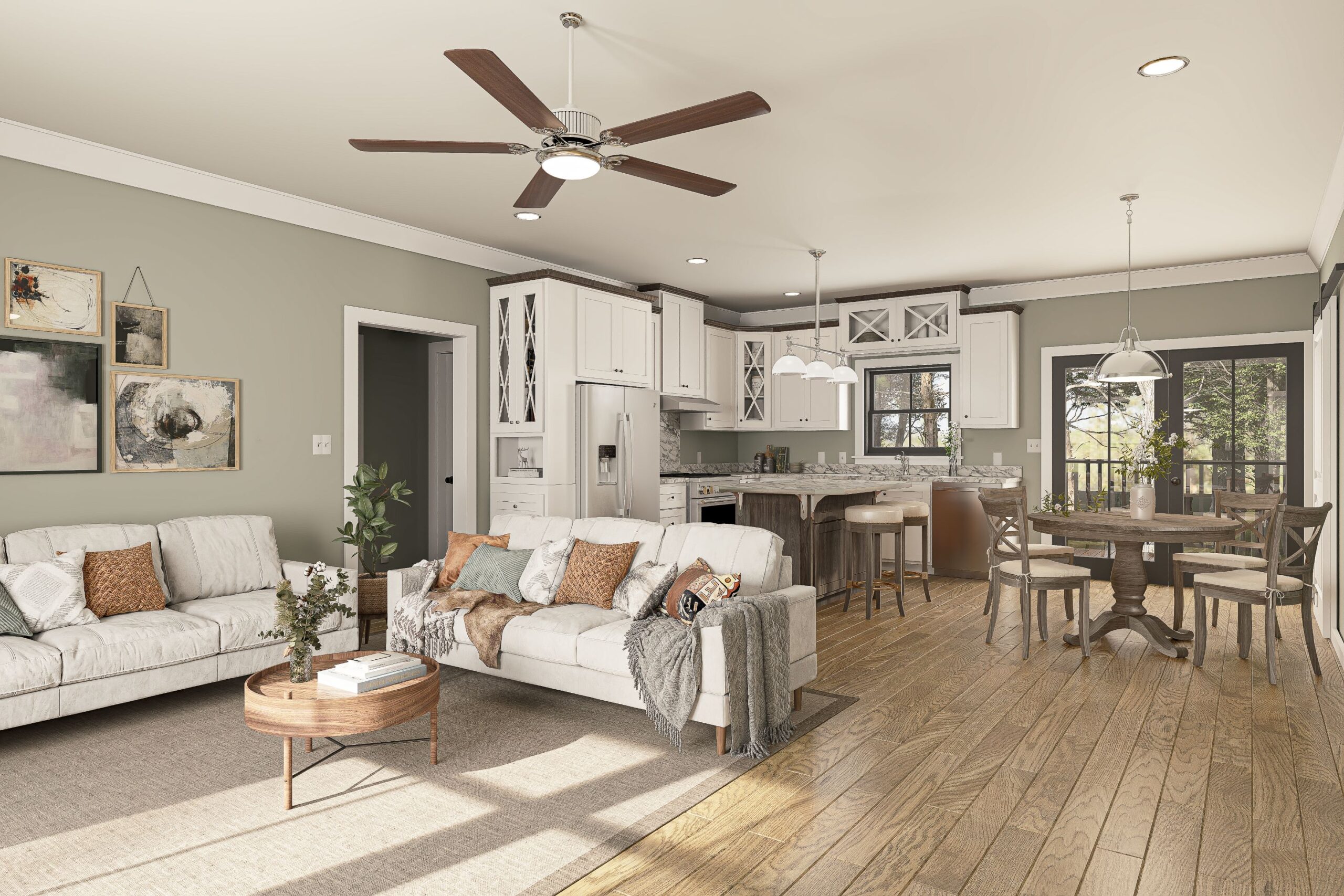 This floor plan offers 1,402 heated square feet with 3 bedrooms and 2 bathrooms. The garage is a drive-under 2-car garage. The main living area is open and spacious, featuring a large island with a counter-high snack bar in the kitchen. Additionally, there is a walk-in pantry in the laundry room. The laundry/mudroom is equipped with a sink, counter space, and locker area. The split bedroom layout provides privacy, with the Master bedroom featuring a walk-in closet, a bathroom with dual sinks, and a custom shower. In the rear, there is an 8-foot-deep deck. The walkout basement includes a 2-car garage, space for a future bathroom, and an owner’s choice room with room for storage.
