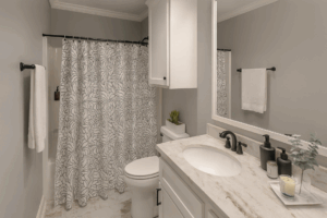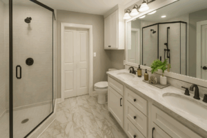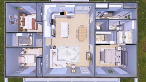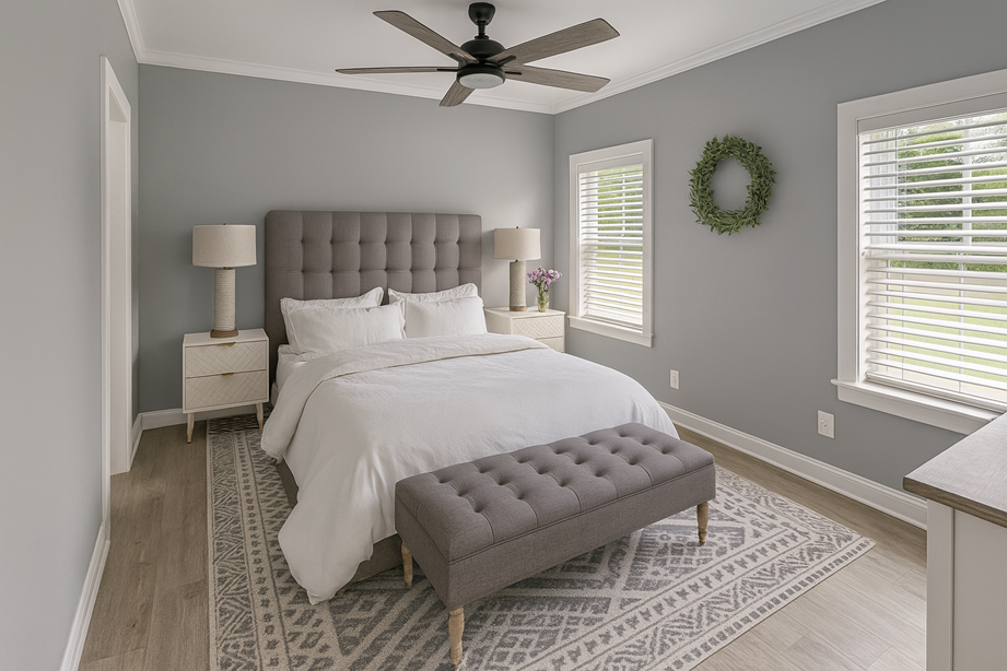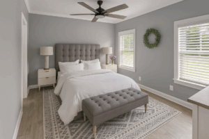 Two bedrooms share a bathroom in the hall between them. The Master bedroom is located on the opposite side of the home for privacy. There is a large, walk-in closet, and the bathroom has a large, custom shower, and dual sinks. The laundry room can be accessed directly from the master bath, and there is an extra closet there for more storage.