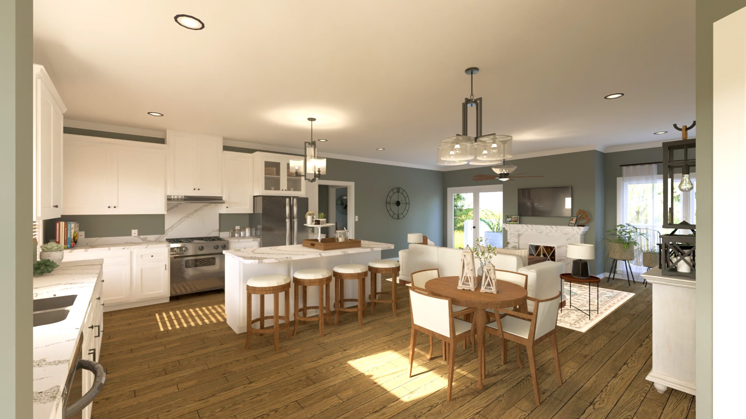 Kitchen is spacious, featuring a large island with seating, a Walk-in Pantry, and a Dining Area. The Great