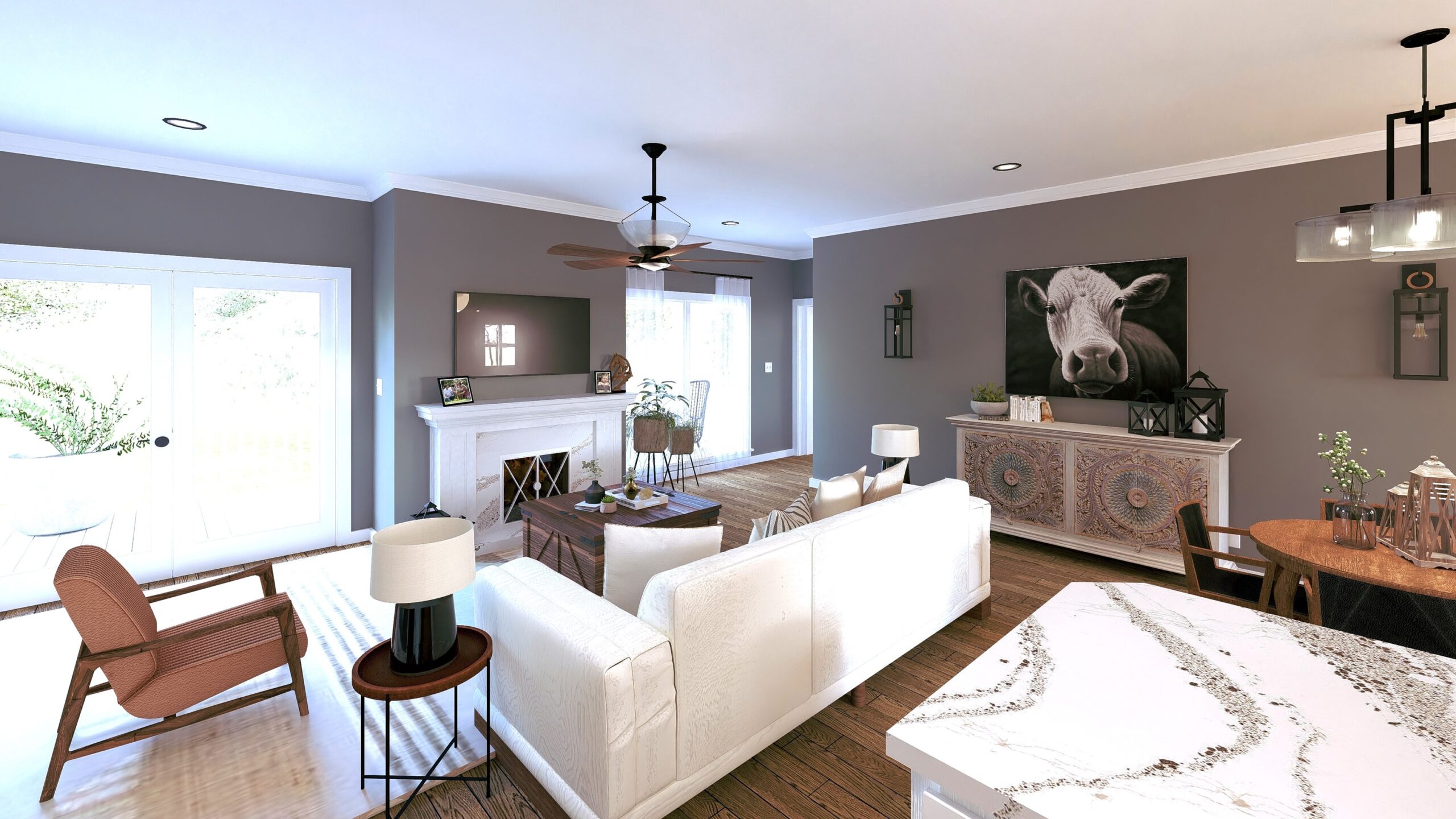 Room boasts a ventless gas fireplace and french doors that open onto the large rear deck. The master