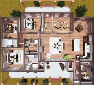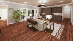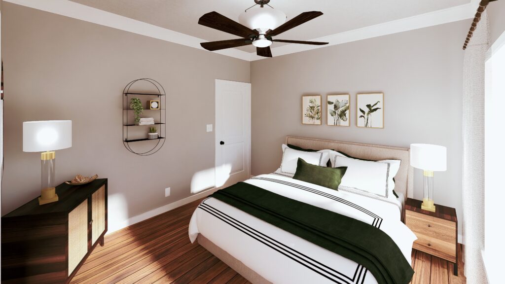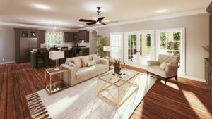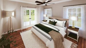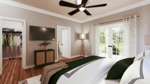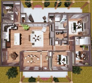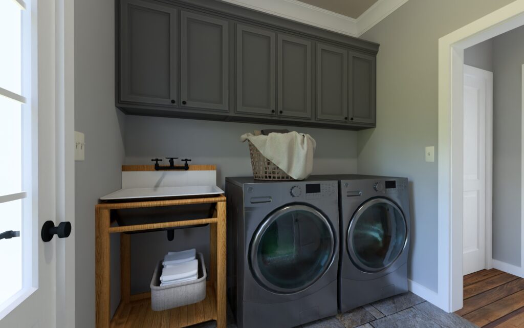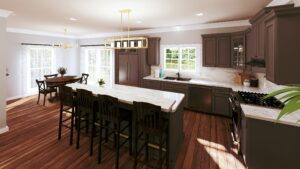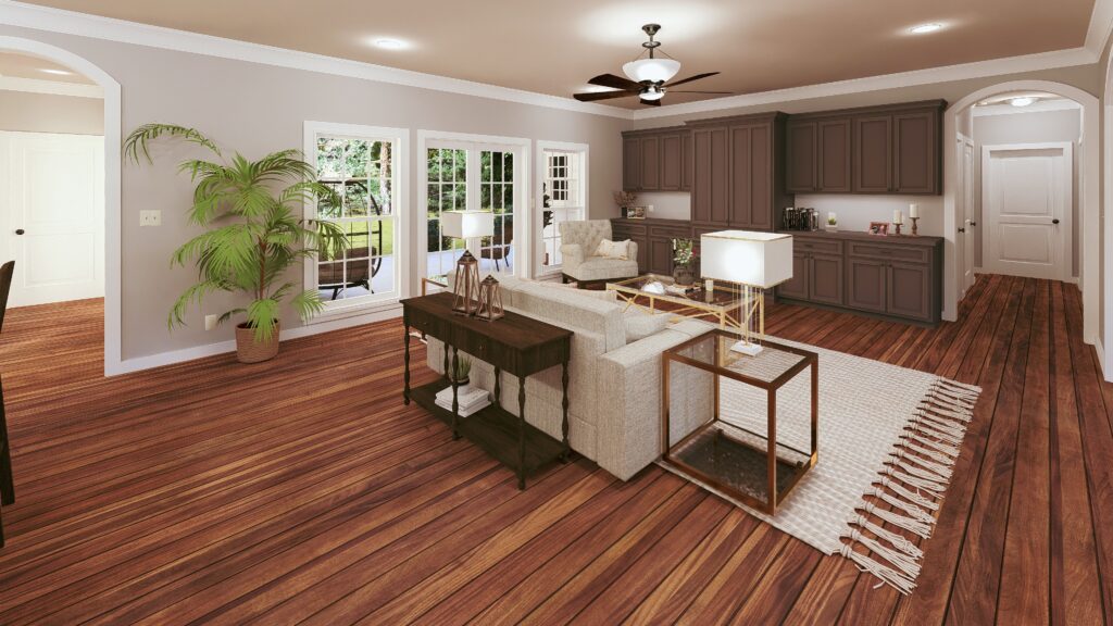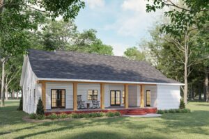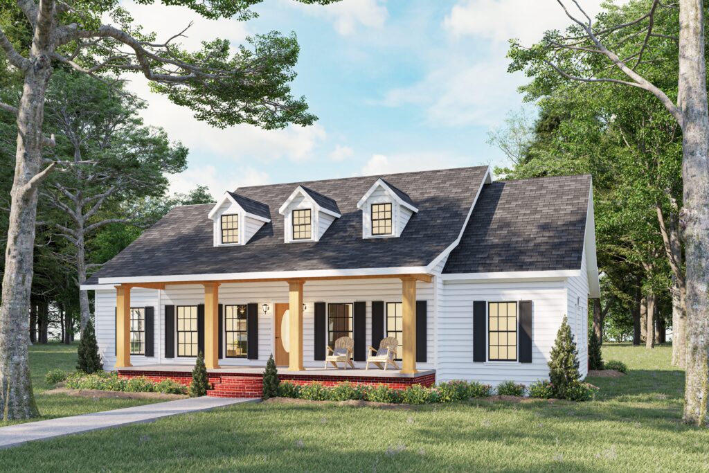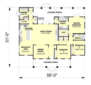 There is a covered porch in the front and back of this home. The dining room is to the left of the entry through the front door. From the dining room, is the Great room, kitchen, and breakfast area which has an open floor plan. The kitchen has an island with seating. All of the bedrooms are in one hall of the home. . The laundry room, pantry and a 1/2 bath are in a hall from the kitchen.