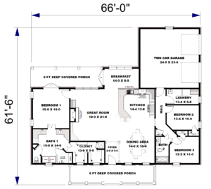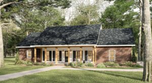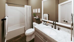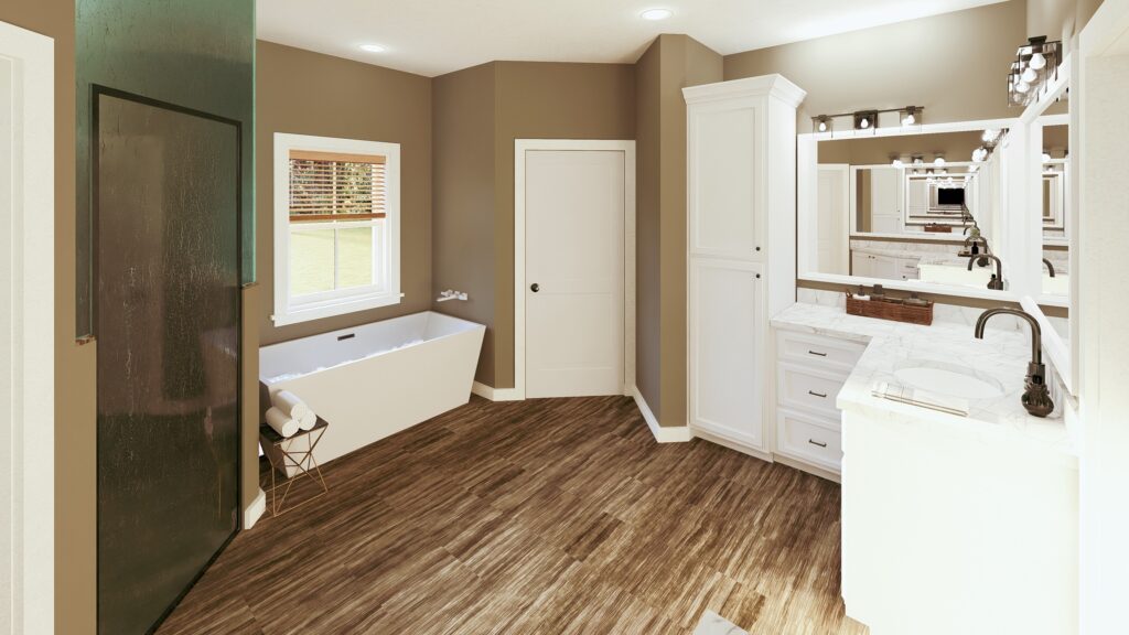 This cute farmhouse features three bedrooms, two bathrooms, a large kitchen, and an open-concept design with a split bedroom layout – all within 2,096 square feet. The kitchen includes a counter-high snack bar; pantry cabinets flank the refrigerator with a view out the rear Breakfast Area. In the Great Room, a gas fireplace stands surrounded by custom-built cabinets, providing extra storage. The primary bedroom is a very nice size and includes french doors that lead onto the covered 8ft deep rear porch. This primary bathroom features a large his-and-her closet, dual sinks with extra storage, and a freestanding bathtub next to the custom shower. Bedrooms 2 and 3 share a hall bath and are steps away from the Laundry room.