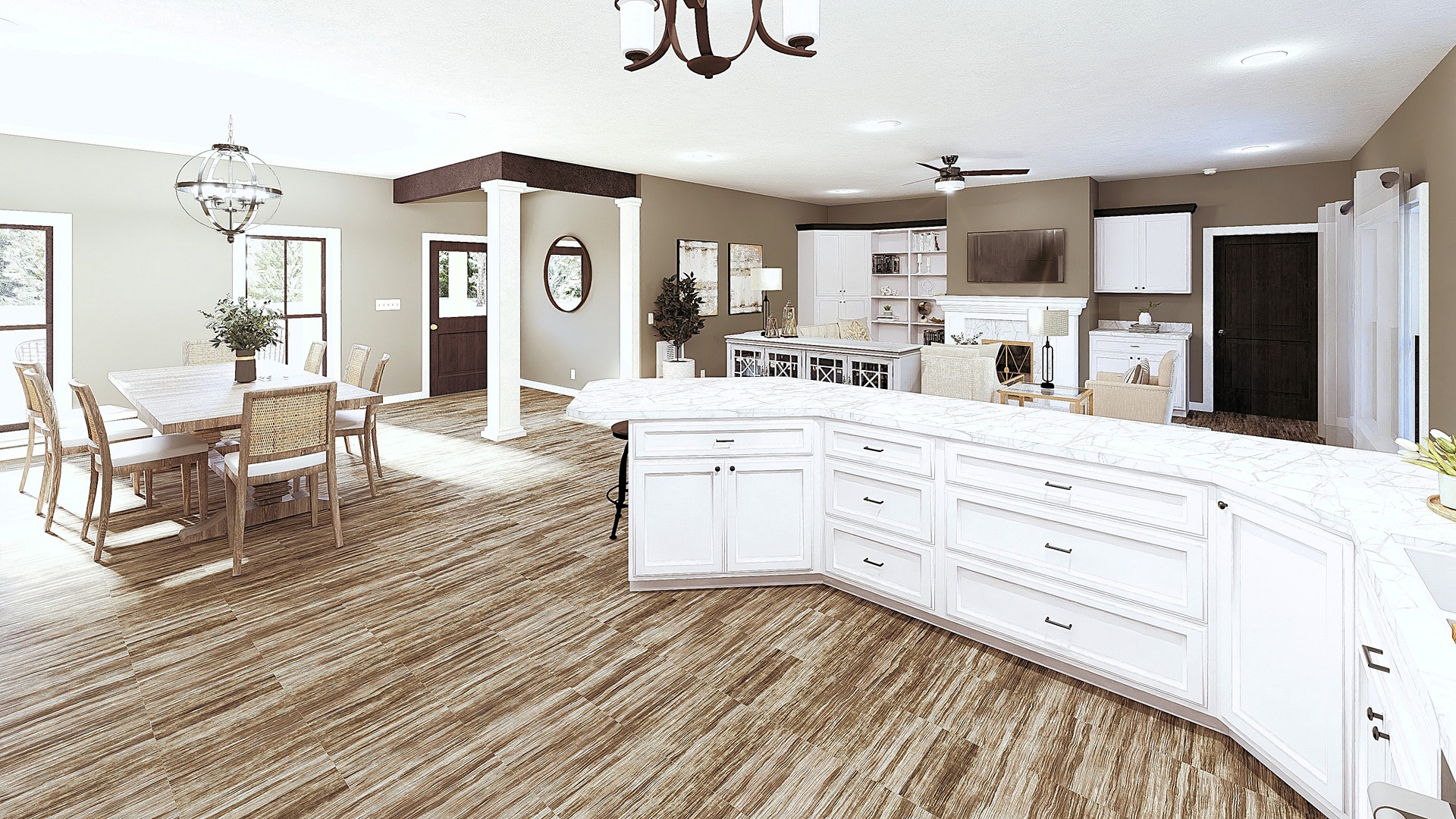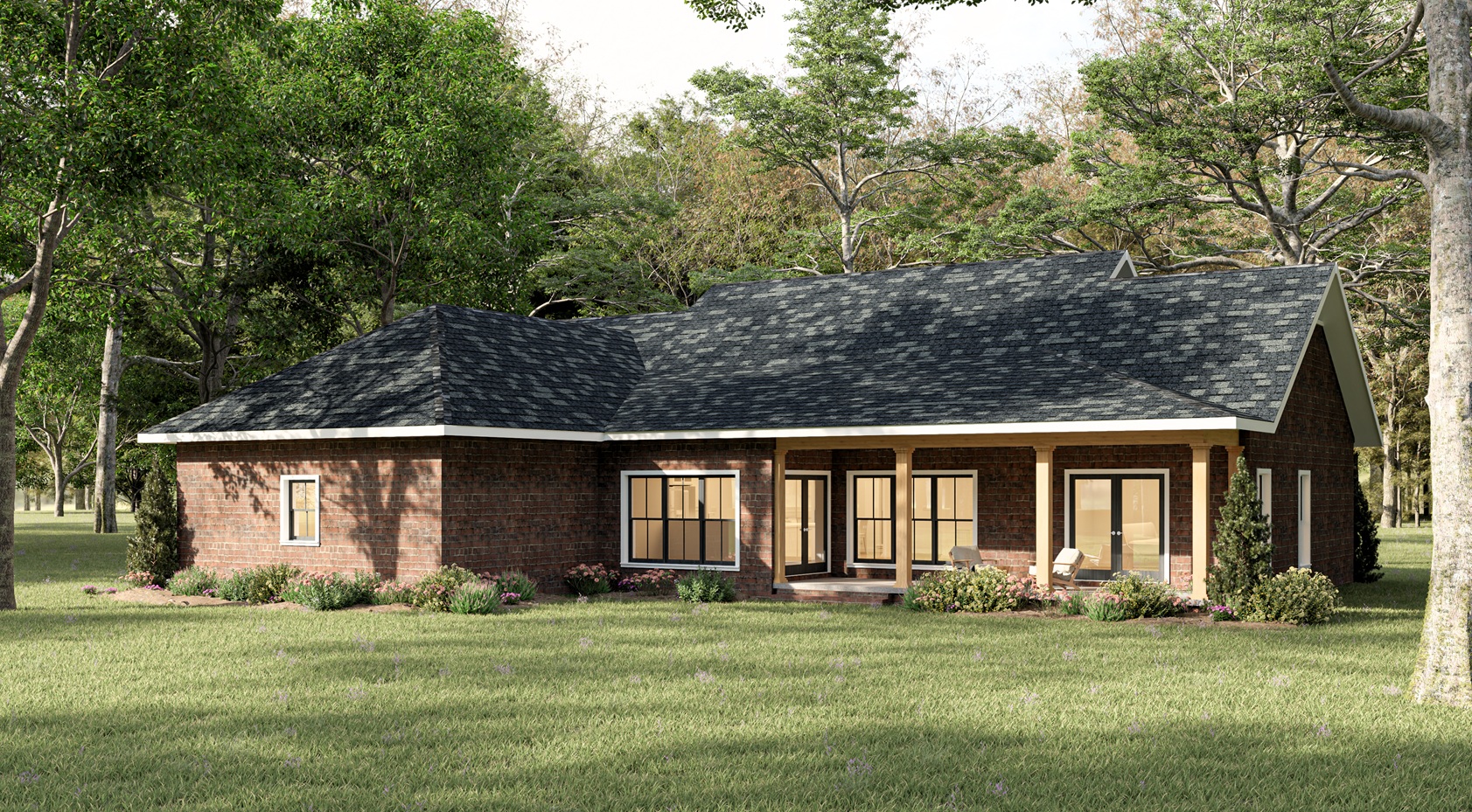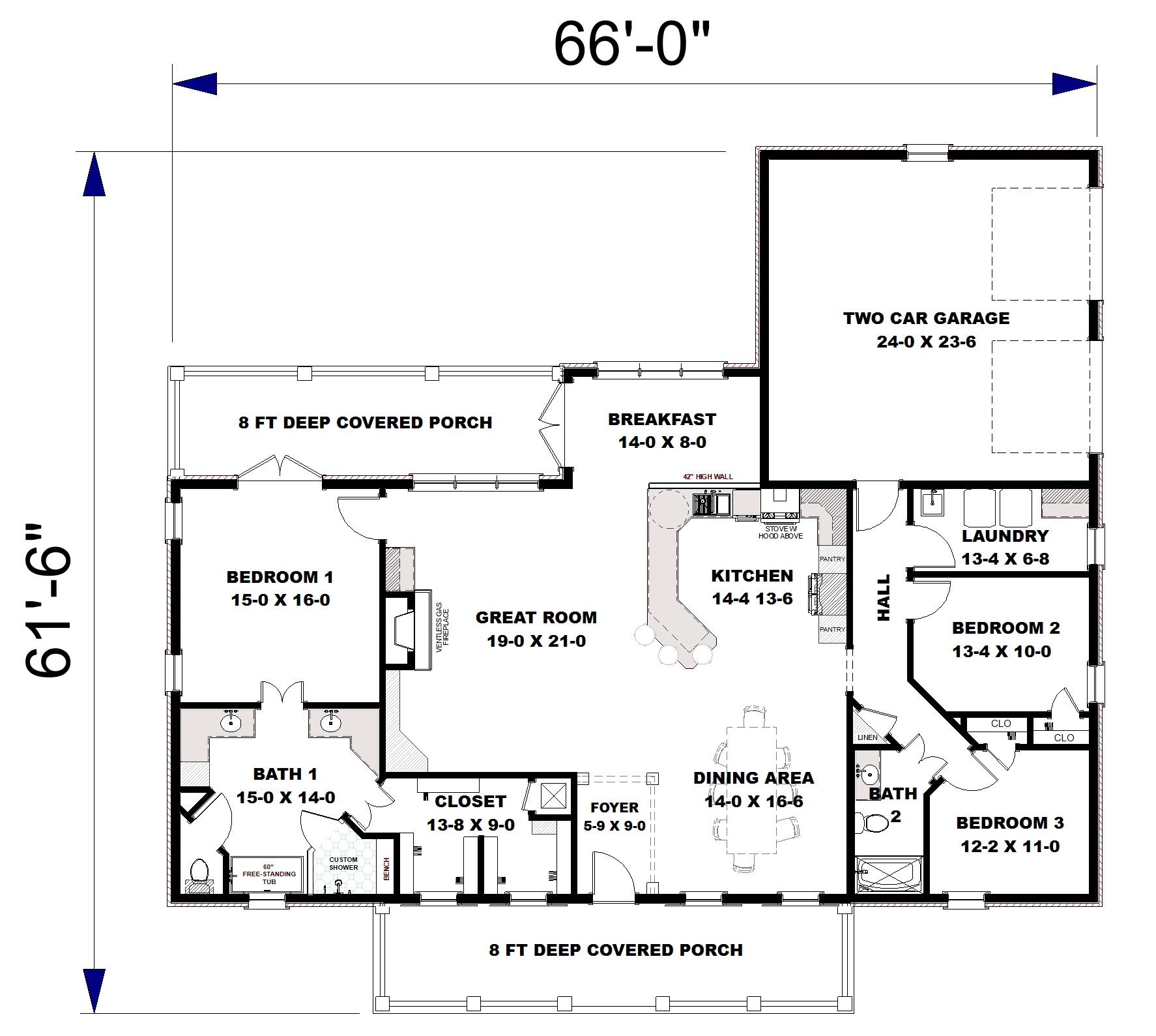 This cute farmhouse features three bedrooms, two bathrooms, a large kitchen, and an open-concept design with a split bedroom layout – all within 2,096 square feet. The kitchen includes a counter-high snack bar; pantry cabinets flank the refrigerator with a view out the rear Breakfast Area. In the Great Room, a gas fireplace stands surrounded by custom-built cabinets, providing extra storage. The primary bedroom is a very nice size and includes french doors that lead onto the covered 8ft deep rear porch. This primary bathroom features a large his-and-her closet, dual sinks with extra storage, and a freestanding bathtub next to the custom shower. Bedrooms 2 and 3 share a hall bath and are steps away from the Laundry room.