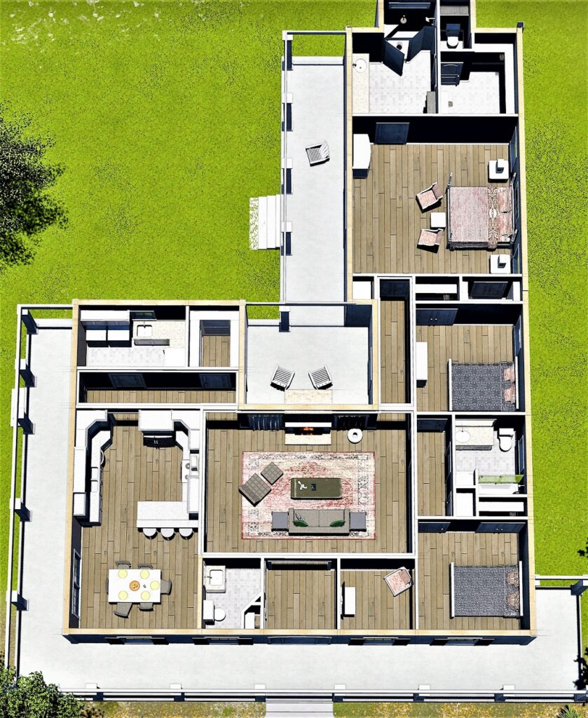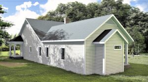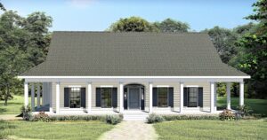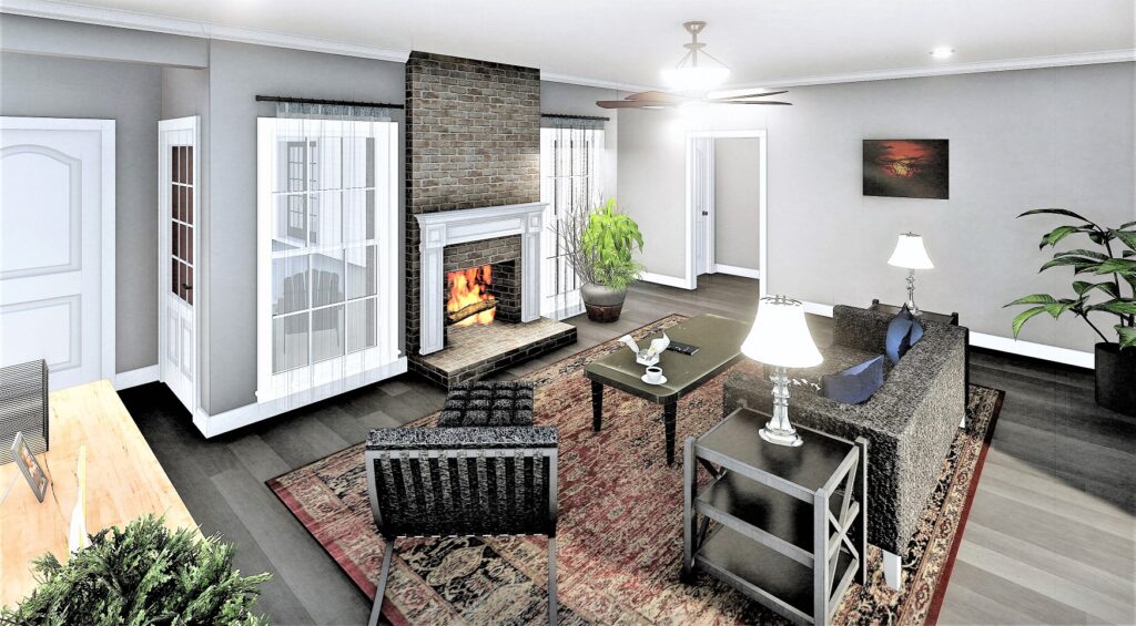 The Great Room has a wood-burning fireplace, flanked with windows to overlook the rear “L” shaped porch.