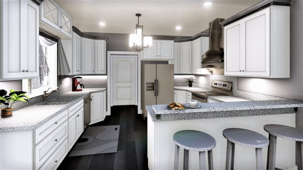 The Kitchen and Dining area have lots of windows; this area contains a raised snack bar with easy access to the Laundry/Mud Room and the huge walk-in pantry.