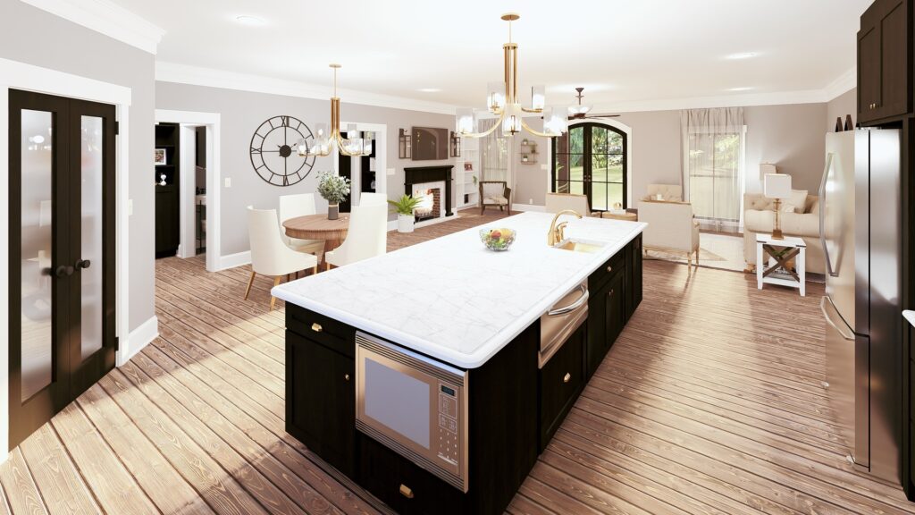 Embrace the culinary enthusiast within you in the open kitchen that seamlessly integrates with the large great room. This design creates an inviting space for family gatherings and entertaining guests. The kitchen’s huge island not only serves as a centerpiece but also as a practical workspace for meal preparation and casual dining. You’ll never run out of storage space with the huge walk-in pantry.
