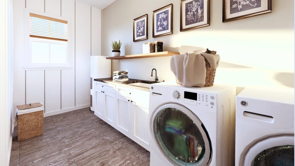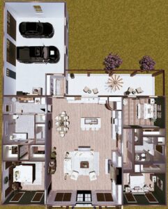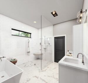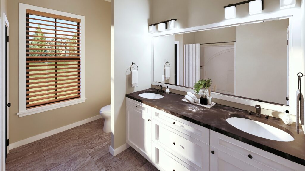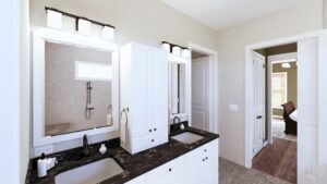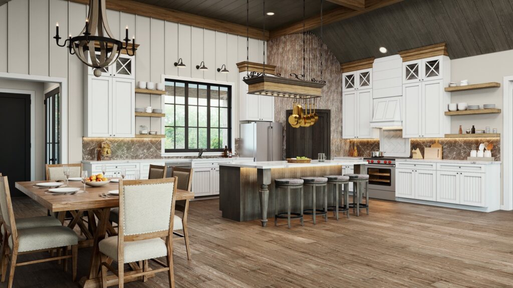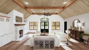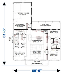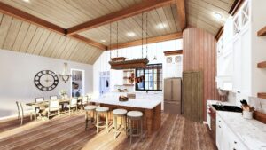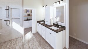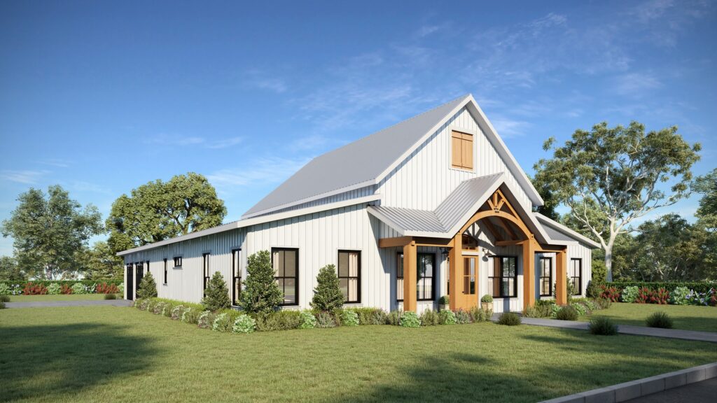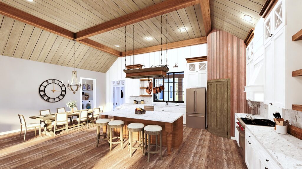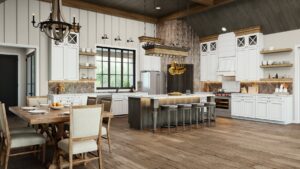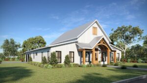 This stunning farmhouse/barndominium features 3 bedrooms, 2 bathrooms, a huge laundry room, and an open concept design with a split bedroom layout – all within 2,460 square feet. The kitchen includes an island with a counter-high snack bar, lots of cabinets for storage, and a unique silo-style pantry in the corner. In the Great Room, a gas fireplace stands surrounded by custom built-in cabinets, providing extra storage. The Great Room/Kitchen ceilings are vaulted to 14’ and showcase exposed wood beams capturing the rustic, country style. The Master Bedroom includes his and her closets, plus a luxurious master bathroom with dual sinks, and a freestanding bathtub near the oversized, open shower. An optional shower layout is included for those that would prefer more privacy. An oversized garage is connected to the house and contains 2 parking spaces plus a workshop or storage area.