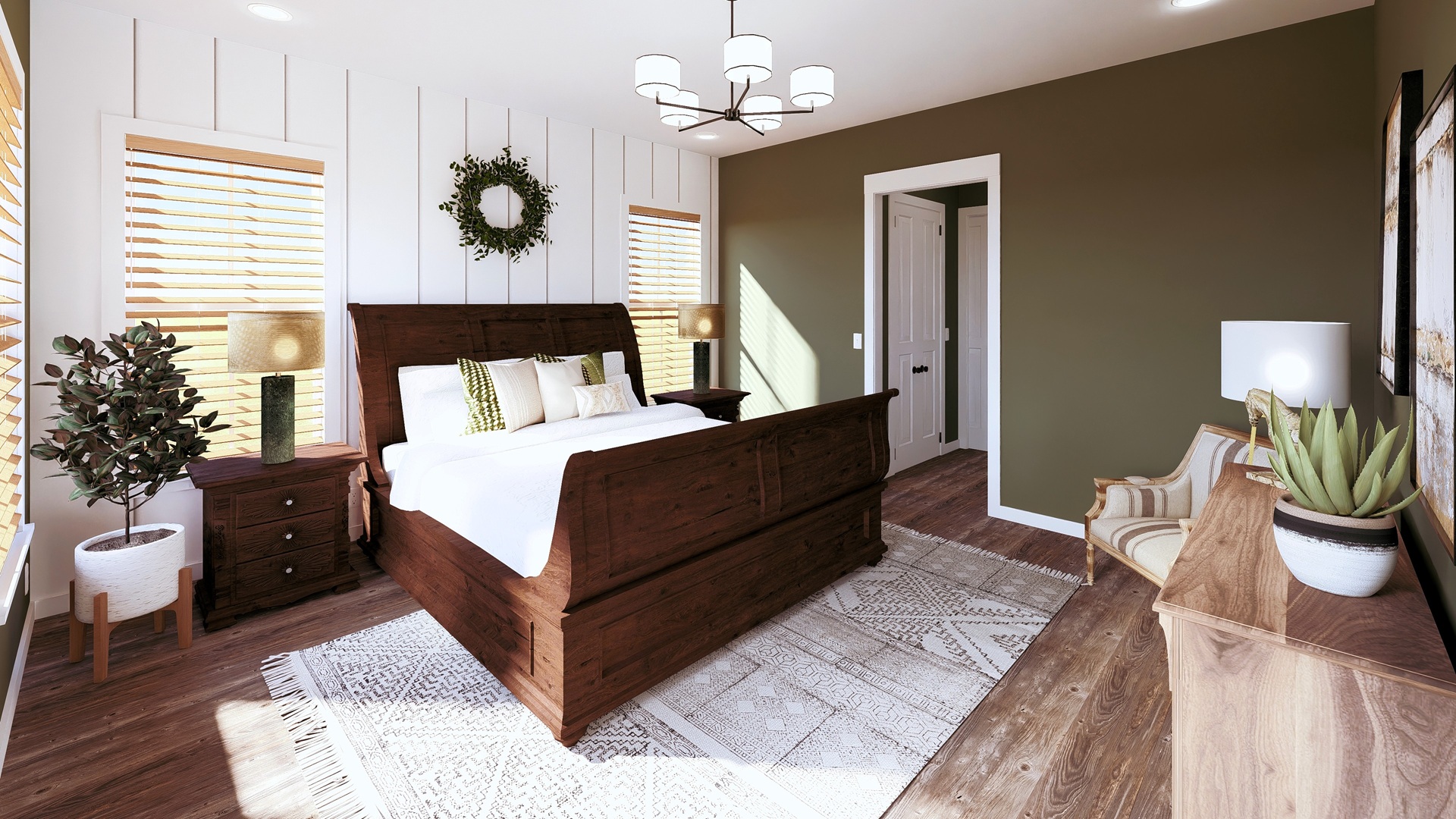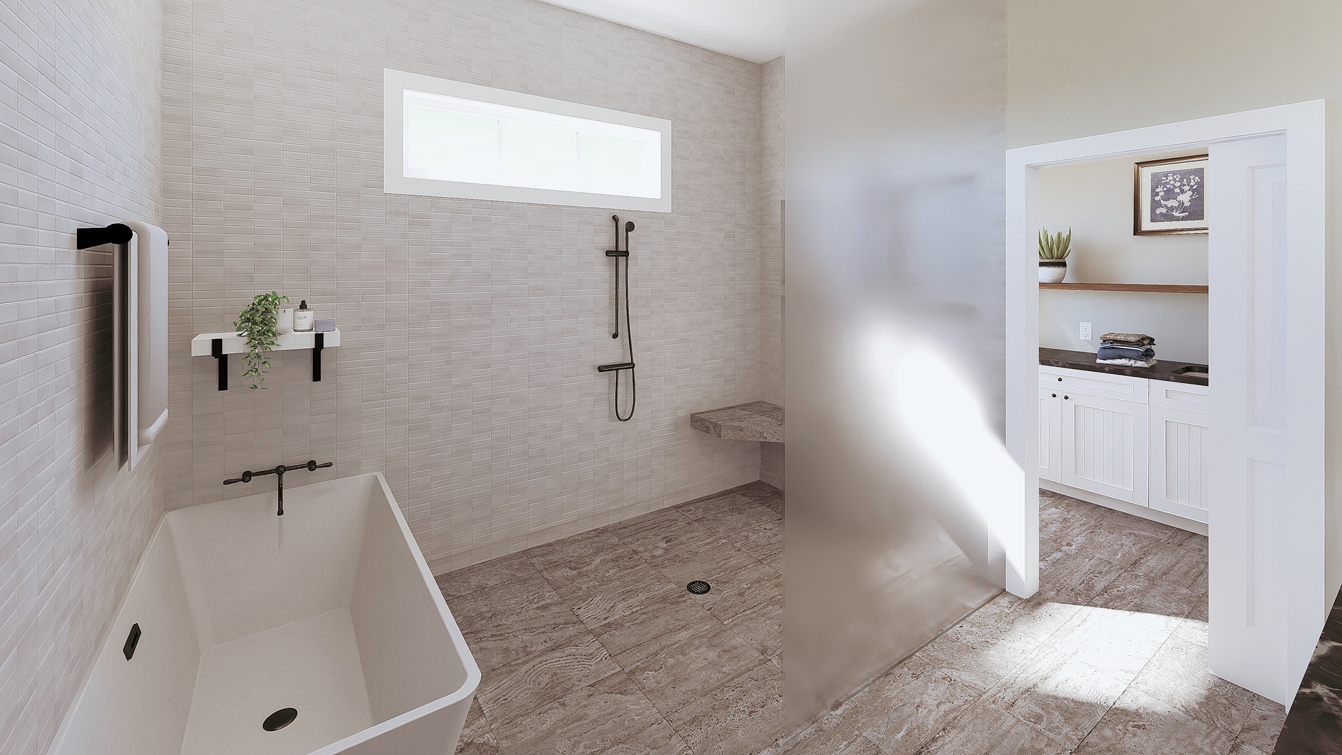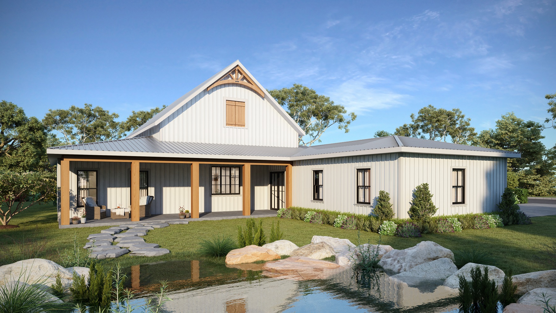 This stunning farmhouse/barndominium features 3 bedrooms, 2 bathrooms, a huge laundry room, and an open concept design with a split bedroom layout – all within 2,460 square feet. The kitchen includes an island with a counter-high snack bar, lots of cabinets for storage, and a unique silo-style pantry in the corner. In the Great Room, a gas fireplace stands surrounded by custom built-in cabinets, providing extra storage. The Great Room/Kitchen ceilings are vaulted to 14’ and showcase exposed wood beams capturing the rustic, country style. The Master Bedroom includes his and her closets, plus a luxurious master bathroom with dual sinks, and a freestanding bathtub near the oversized, open shower. An optional shower layout is included for those that would prefer more privacy. An oversized garage is connected to the house and contains 2 parking spaces plus a workshop or storage area.