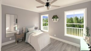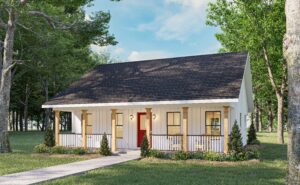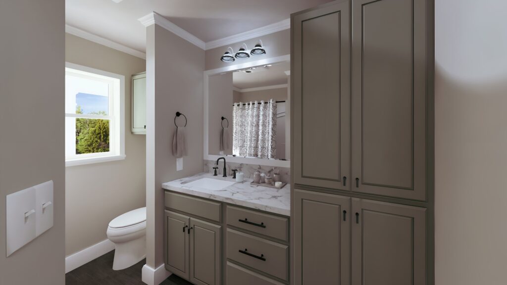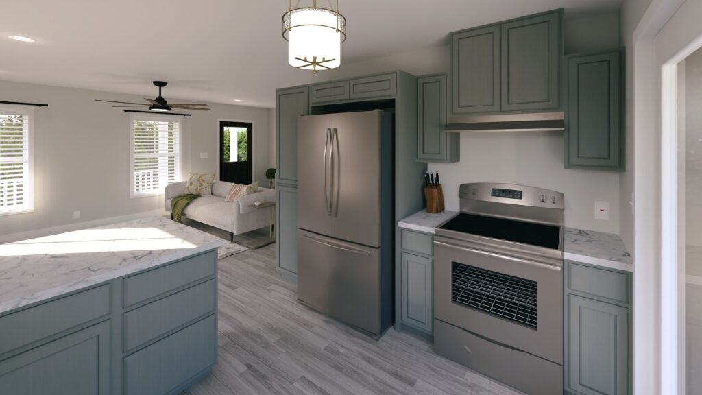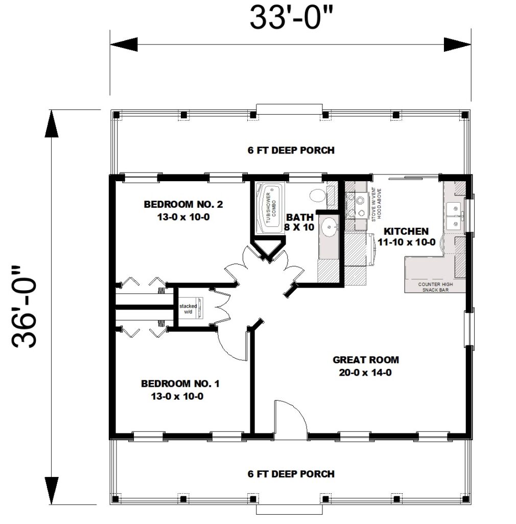 The bathroom has a tub/shower combo. There is a pantry in the kitchen, upper and lower cabinets to provide storage for all your kitchen necessities, and of course the counter-high snack bar. There is a sliding door that leads out of the kitchen to the rear covered porch. Both the front and the back porches are 6 feet-deep.