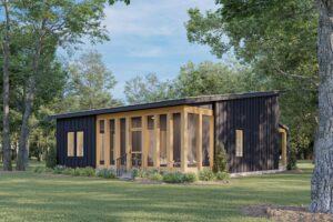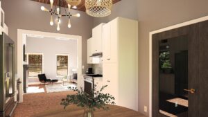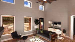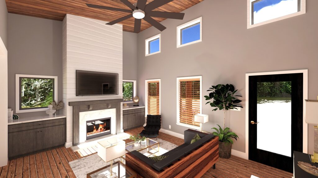 Bedroom 1. The ceilings are sloped, ranging from 14′ (approx) at the front to 9’ at the rear. A five-foot deep covered front porch spans the width of the house, inviting you into the Great Room, which