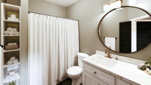 includes a vanity and a storage nook with shelves next to the tub/shower. This house plan is ideal for a