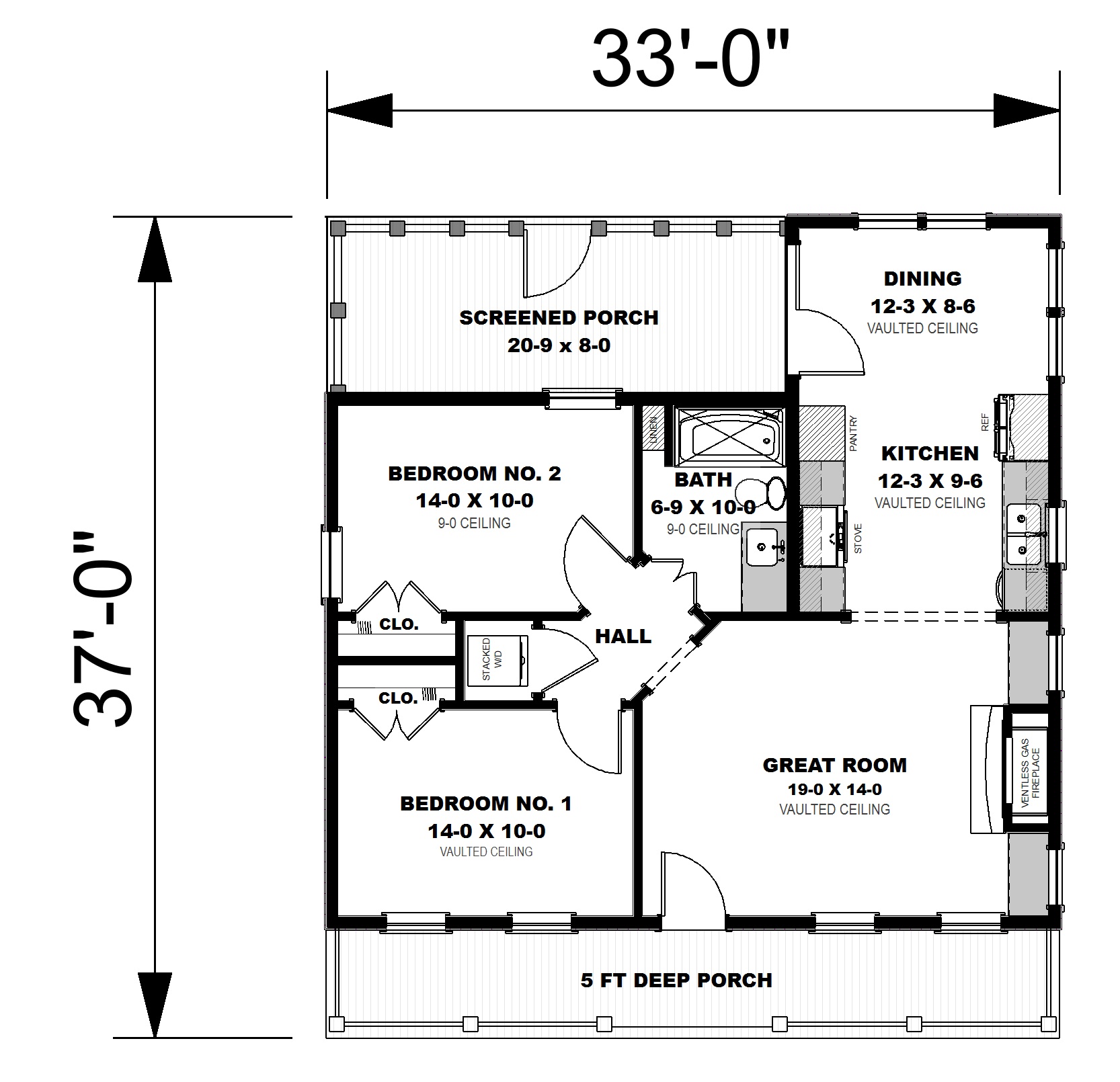 Bedroom 1. The ceilings are sloped, ranging from 14′ (approx) at the front to 9’ at the rear. A five-foot deep covered front porch spans the width of the house, inviting you into the Great Room, which