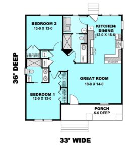 This plan is cute as a button and loaded with personality. She’s adorned with shake siding, stacked columns, and lots of windows. A quaint porch welcomes you to this cute home. Enter the large Great Room that shares a raised snack bar with the Kitchen. The Kitchen/Dining area is open and has lots of cabinets and a pantry. A nice-sized Laundry Room has access to Bath 2 for easy clean-up. Bath 2 is perfect for family and guests. Both bedrooms are nice sized and have lots of closet space. Bedroom 1 has a private bath with dual sinks and linen storage. This cute home has lots of storage. This economical plan may be small but not short on style.