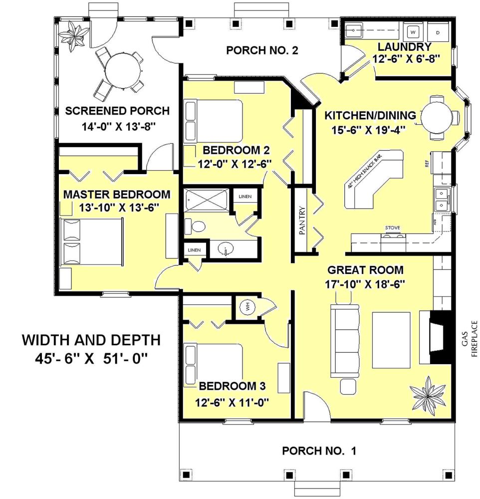 At the rear is porch three, a covered version to play keep away from bugs and pests. Owners will find construction costs for this plan to be minimal.