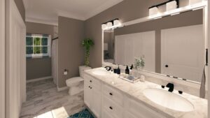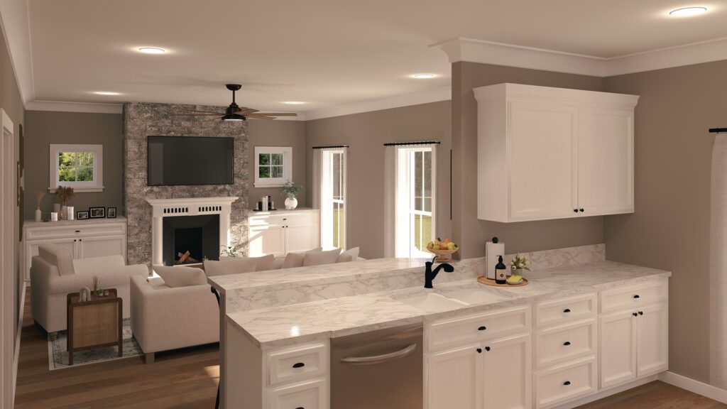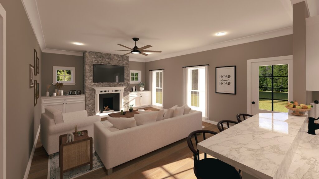 The large open Great Room contains a ventless gas fireplace, flanked by base cabinets and windows above for extra light.