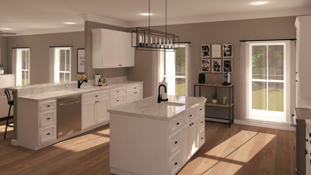 The kitchen has a large island, a counter-high snack bar, and french doors in the Dining Area for extra light and outdoor access.