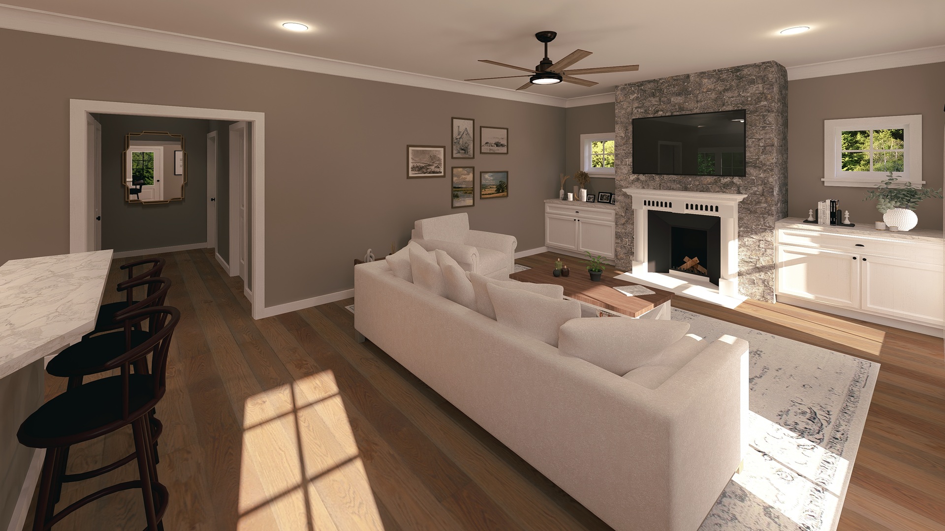 The large open Great Room contains a ventless gas fireplace, flanked by base cabinets and windows above for extra light.