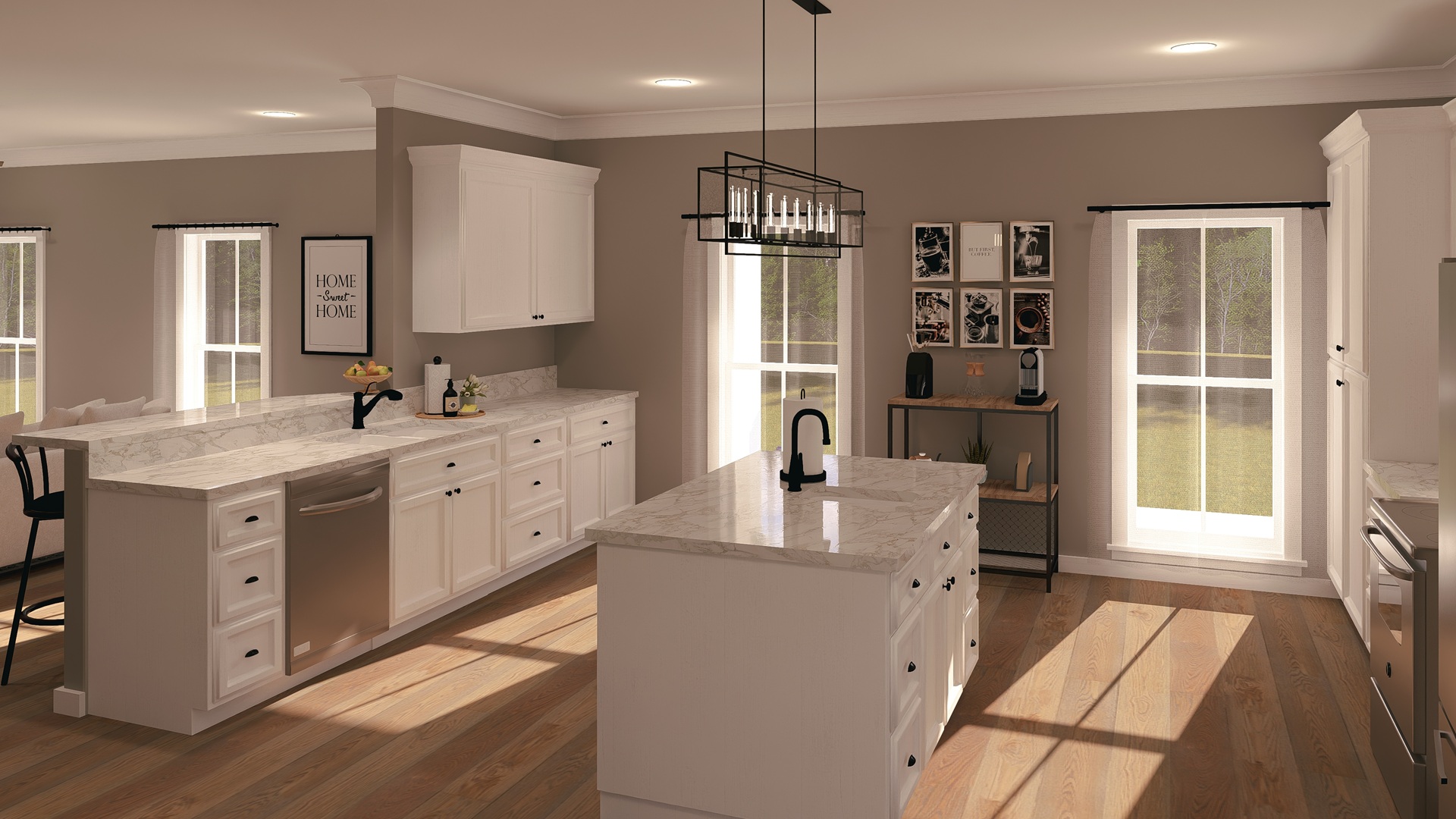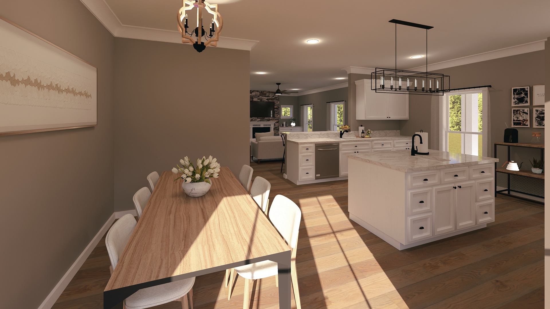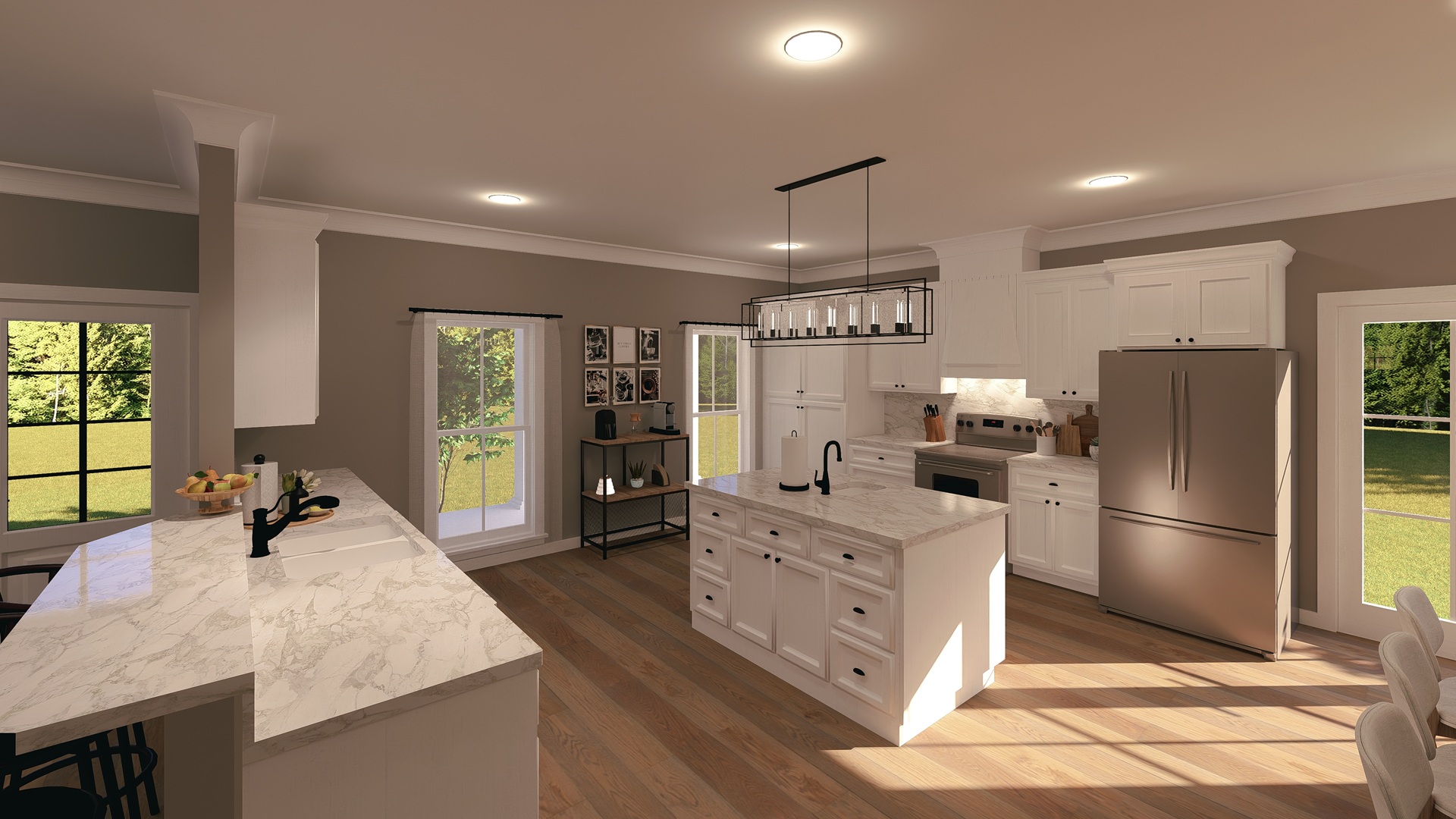 The kitchen has a large island, a counter-high snack bar, and french doors in the Dining Area for extra light and outdoor access.