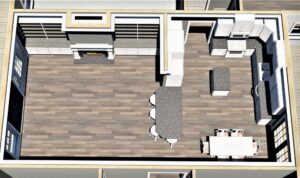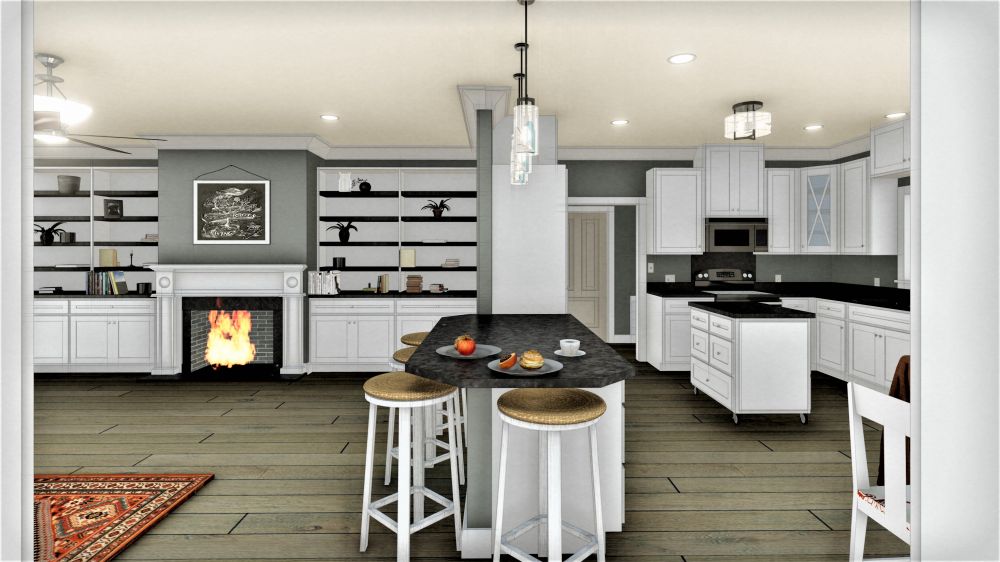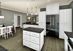 The Kitchen has a stove with a micro vent hood above, a moveable island, and pantry storage flanking the refrigerator.