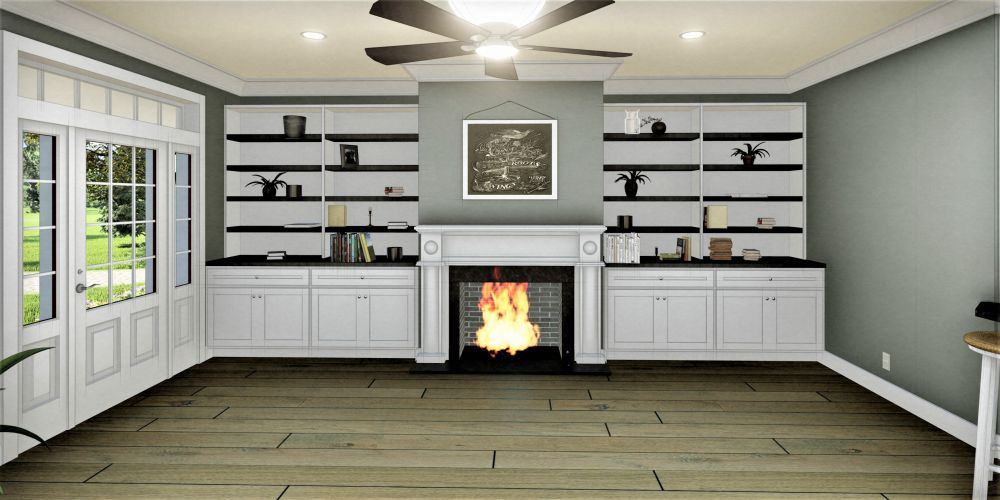 The great Room has a ventless gas fireplace with cabinetry for storage.