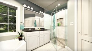 The Master Bath has dual sinks, a corner tub, a large custom shower, and a toilet compartment.