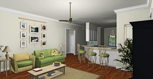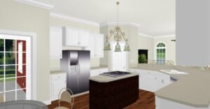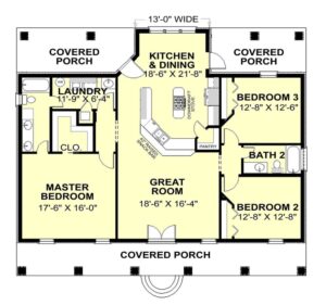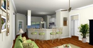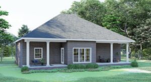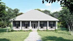 This house says entertaining loud and clear. The front and rear porches are a perfect place for the whole family to get together and embrace the great outdoors. As you enter the home you are struck by the open airy view. The center of the plan is open from the front to the back – great for entertaining family and friends. The kitchen is very open and spacious with cabinets galore, a walk-in pantry, and a raised snack bar. You can teach the kids to cook and still be involved with guests in the Great Room, Top Island. There’s a large Dining Area with views out onto the rear through three large windows and French doors. This is a split plan to allow private time away from the kids. The Master Bedroom is a serene escape with a walk-in closet and Master bath with access to the laundry. Bedrooms two and three are nice sized and share a bath.
