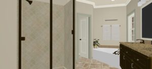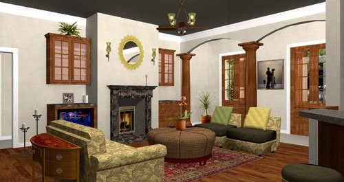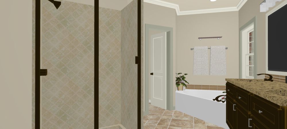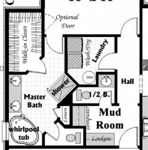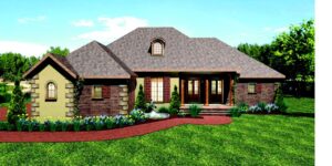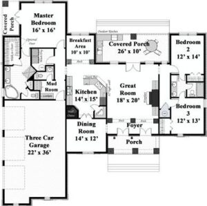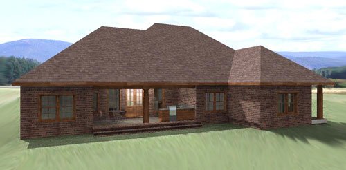 This plan will welcome you home with rustic elegance for today,s families. A ventless gas fireplace, French doors, and columns highlight the Foyer and Great Room of this design. Built-in cabinetry gives you storage for all your entertainment items. The large open kitchen is home to a walk-in pantry, island, and angled wall ovens. This open Kitchen/Great Room design makes entertaining family and friends much more enjoyable, the chef of the house will never feel left out. A raised snack bar creates the perfect spot for a quick snack. You can also enjoy the view from your Breakfast Area, on those sunny mornings. The formal Dining Room has a large window and shares easy access to the Kitchen. The Master Bedroom features a private covered porch accessed through French doors. An optional door for the Master Closet is shown and can replace the closet door in the bath if desired. The Master Bath is a luxurious retreat with dual sinks, a corner whirlpool tub, a large glass-enclosed shower, and a toilet compartment for privacy. The angles make this bath unique without adding a lot to the cost of the house. The Laundry Room contains a front loading Washer and Dryer with a folding counter located above. Deep wall cabinets are located above the washer/dryer for even more storage. The multipurpose Mud Room contains built-in lockers with a bench for seating and drawers for storage. A built-in computer station is added to the room for your home office area or the children’s homework. A Powder Room is located off the Mud Room for family and guests alike. Bedrooms 2 and 3 are located for privacy. Each bedroom is nice sized and shares a compartmentalized style bath. The bath gives plenty of room for getting ready in the mornings with dual sinks and lots of storage. The Rear Covered Porch is home to an Outdoor Kitchen. This porch is so large your going to want to spend all your free time here. The Three Car Garage is positioned to take the emphasis off its size.
