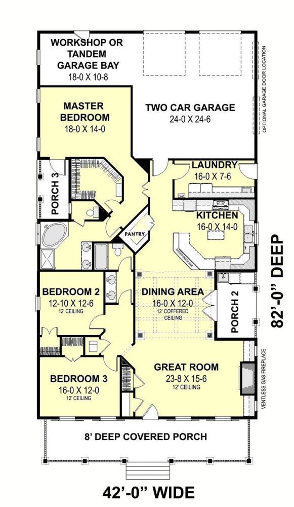 The Garage has room for two cars and a workshop area OR moves the garage doors to the right side (optional) for a Tandem Garage Bay to house three cars!