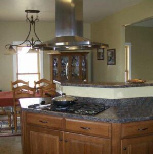 From the Great Room, a 5′-0″ high wall separates the angled bar kitchen from the guests view without closing off the cook. The island holds a drop-in downdraft range and built-in convection/microwave combo. A 42″ high raised snack bar gives an extra eating area to the Dining Area.
