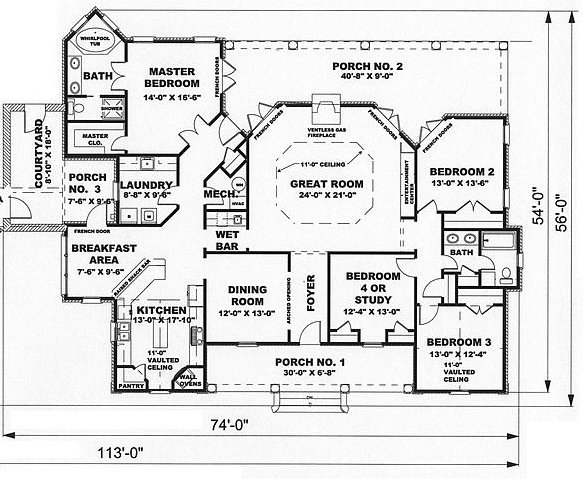 The Great room is great for entertaining … with interesting angles, French doors, access to a wet bar area, and a huge covered rear porch.