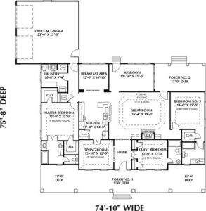 The Great Room is highlighted with a stepped ceiling, rising to 11′-0″ and warmed by a vent-less gas fireplace.