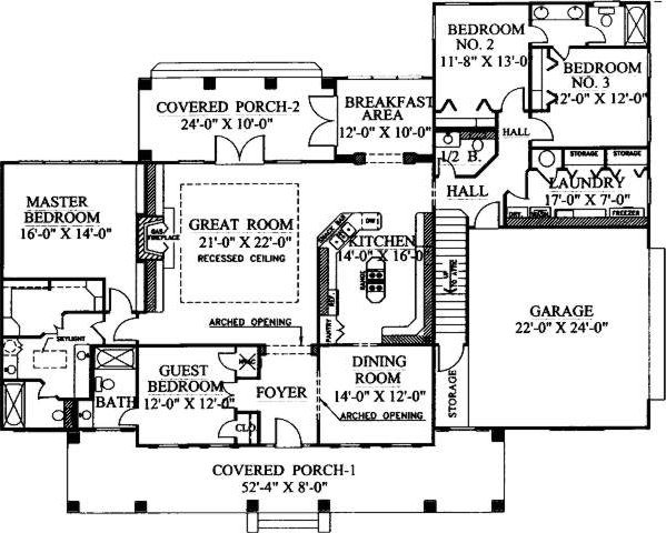 Walk under the archway into the great room and view a recessed ceiling, gas fireplace, custom cabinets, and access to a large covered rear porch through french doors.