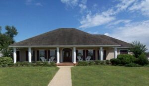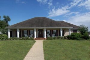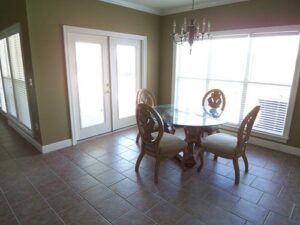 Arched openings greet guests as they enter the foyer. The elegant dining room on the right and a guest bedroom with a full bath to the left.