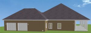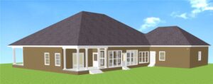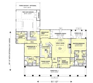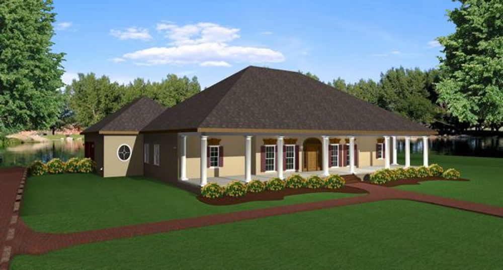 Dual Master Bedrooms with full spa baths and walk-in closets, make this plan unique. The second Master could be used for the Grandparents, Guests, or that boomerang child. Each bedroom ceiling is recessed to 10′ for an elegant open feeling. The Master Bedroom has a wide covered porch accessed by double French doors.