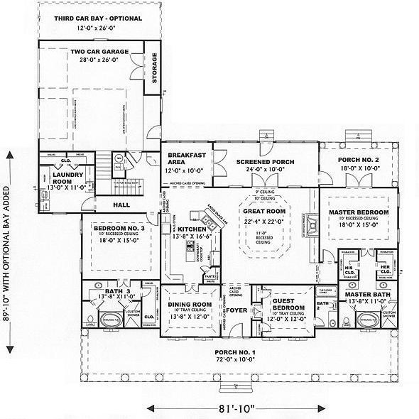 Dual Master Bedrooms with full spa baths and walk-in closets, make this plan unique. The second Master could be used for the Grandparents, Guests, or that boomerang child. Each bedroom ceiling is recessed to 10′ for an elegant open feeling. The Master Bedroom has a wide covered porch accessed by double French doors.