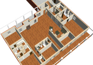 The Large Great Room has an 11′ Tray ceiling, gas fireplace, and a French door leading onto the covered rear porch.