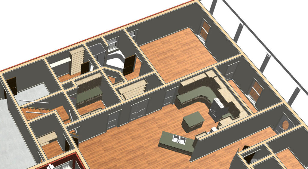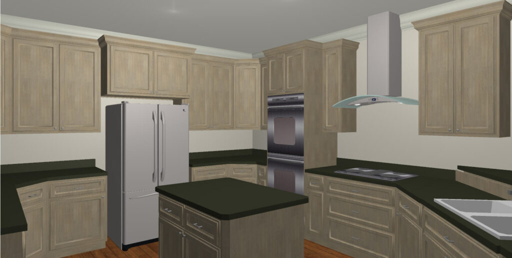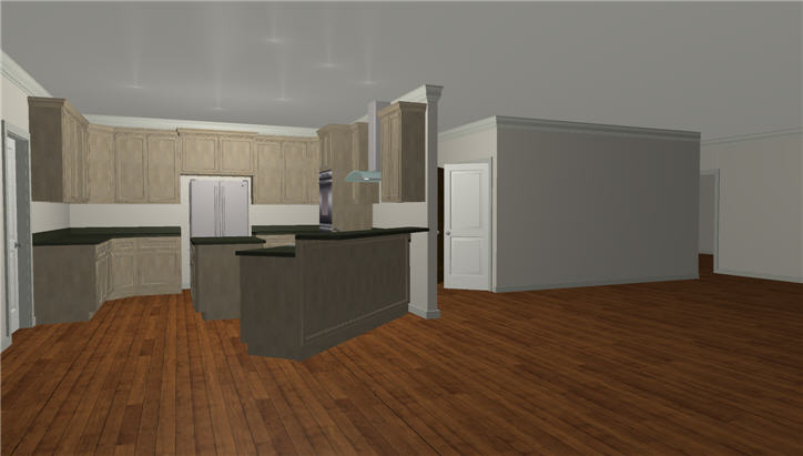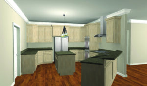 The Kitchen is open to the Dining Area and Great Room with an angled snack bar. Built-in ovens and cooktop share an island for extra counter space. The highlight of the Kitchen is the 4’X 10′ walk-in pantry!