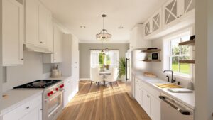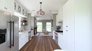 There is a big kitchen and a utility room with a stacked washer and dryer.
